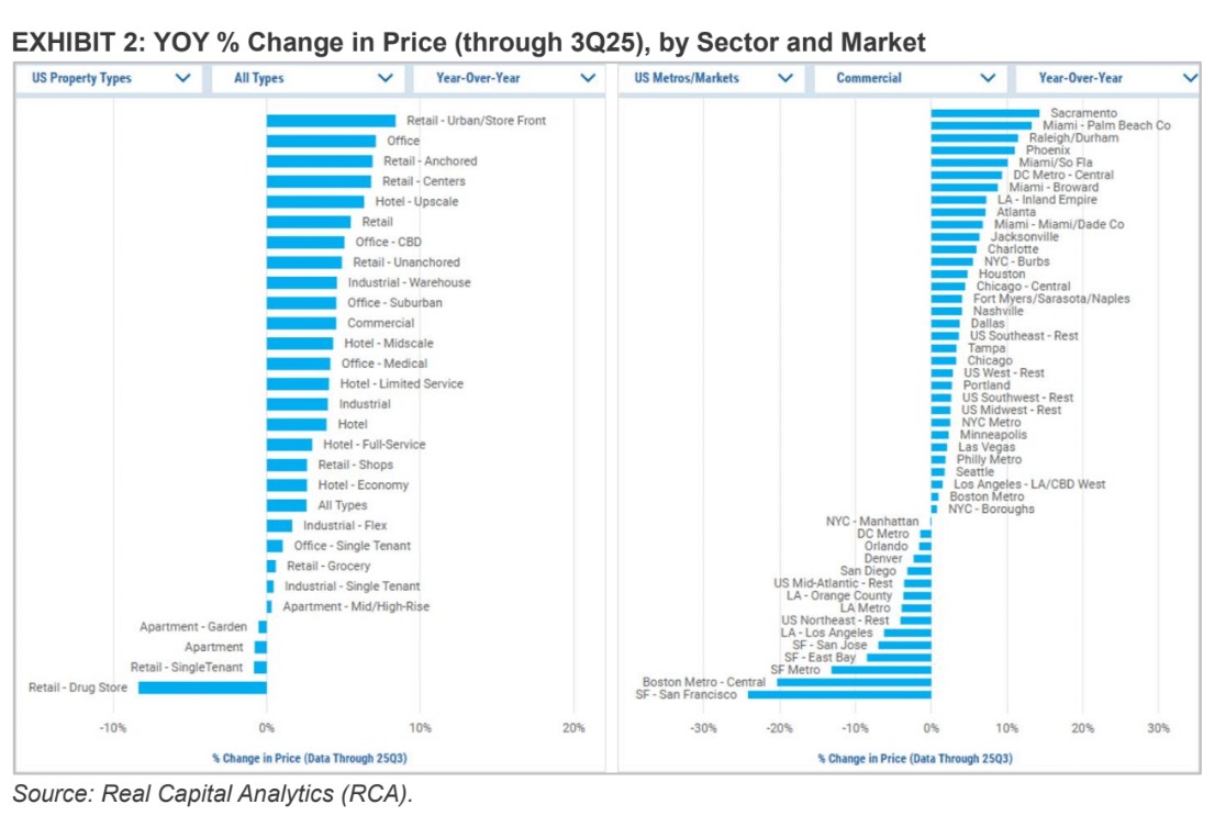Transaction volume up, but unevenly. Total U.S. CRE volume reached $385.7 billion through October 2025, up 13% YoY (MSCI Real Assets). Development sites, office, retail and senior housing outperformed, while multifamily and industrial lagged.